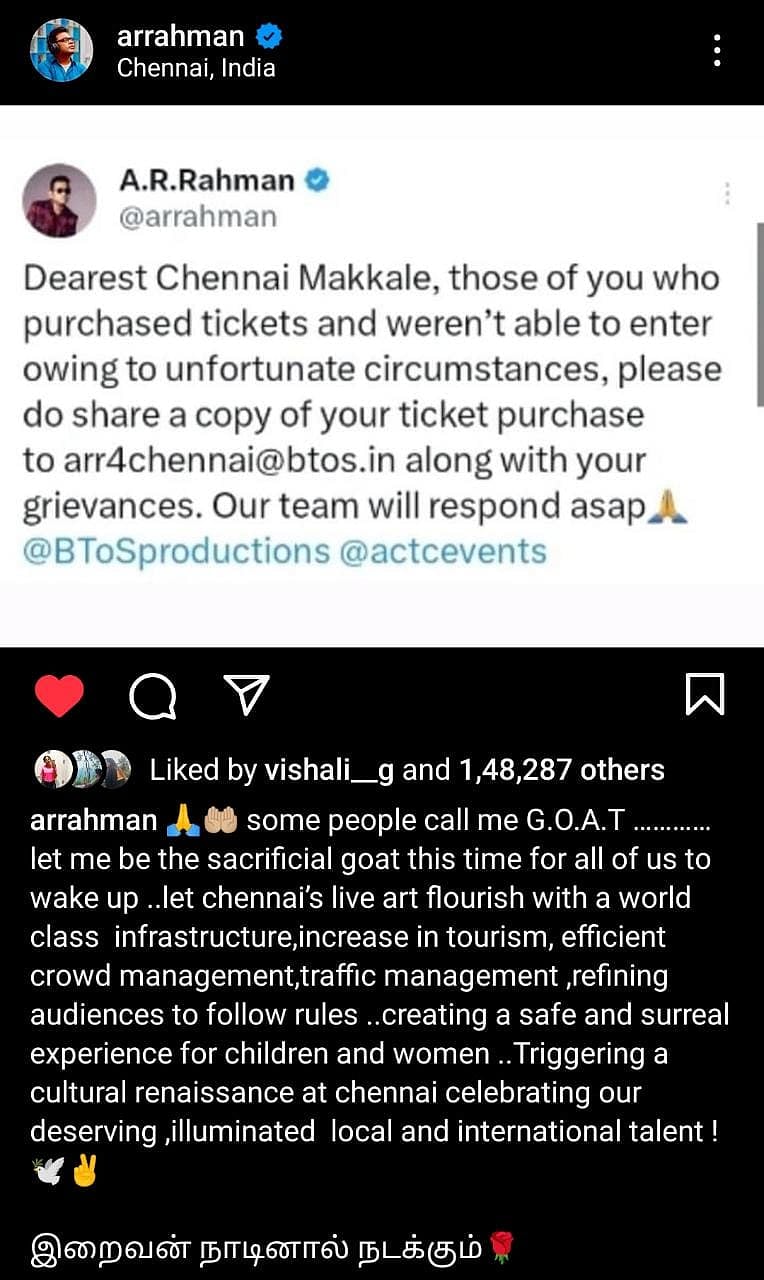 இந்த நிலையில், ஏ.ஆர்.ரஹ்மான் தனது எக்ஸ் தளத்தில், “அசாதாரணான சூழ்நிலையால் நிகழ்ச்சியில் பங்கேற்க முடியாதவர்கள் உங்கள் குறைகளுடன் உங்கள் டிக்கெட் நகலையும் arr4chennai@btos.in என்ற மின்னஞ்சல் முகவரிக்கு அனுப்பவும். விரைவில் எங்கள் குழுவினர் பதிலளிப்பார்கள்!” எனப் பதிவிட்டார். மேலும், தனது இன்ஸ்டா பக்கத்தில், “மக்கள் விழித்துக்கொள்ள நானே பலியாடு ஆகிறேன். உலகத்தர கட்டமைப்பு, சுற்றுலா மேம்பாடு சிறந்து விளங்குவதற்காக வாய்ப்பு நமக்கு வேண்டும்!” எனத் தெரிவித்தார்.