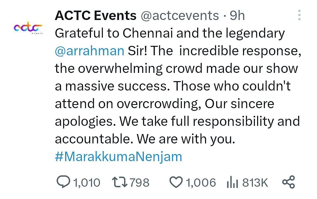 ஆனால், தனது எக்ஸ் பக்கத்தில் பதிலளித்த சம்பந்தப்பட்ட ஏ.சி.டி.சி ஈவன்ட் நிறுவனம், “பெருமை வாய்ந்த சென்னைக்கும், ஏ.ஆா்.ரஹ்மான் சாருக்கும் நன்றி. நம்பமுடியாத அளவுக்கு வரவேற்பு கிடைத்திருக்கிறது. அபரிமிதமான கூட்டம் எங்கள் நிகழ்ச்சியை மாபெரும் வெற்றியடையச் செய்திருக்கிறது. கூட்ட நெரிசலால் நிகழ்ச்சியில் கலந்துகொள்ள முடியாதவர்கள் எங்களை மன்னிக்கவும். அதற்கான முழுப்பொறுப்பையும் நாங்கள் ஏற்றுக்கொள்கிறோம்!” எனப் பதிவிட்டது. ஆனால் ரசிகர்களோ, `மன்னிப்பு இருக்கட்டும் சரி, எங்கள் பணத்தை யார் திருப்பித் தருவது?’ என விடாமல் கேள்வி எழுப்பிக்கொண்டிருந்தனர்.