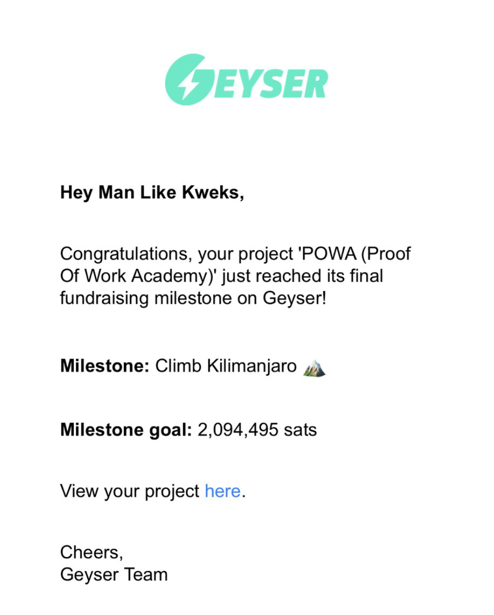 Kweks தொடர்ந்து Nostr மற்றும் X இல் கல்வி ஆதாரங்களை இடுகையிடுகிறது மற்றும் பகிர்ந்து கொள்கிறது, அதே நேரத்தில் கல்வி வளமான POWA கிளிமஞ்சாரோவிற்கு அருகில் உள்ள தான்சானியர்களுக்கு இலவச கல்வி வகுப்புகளை வழங்குகிறது.