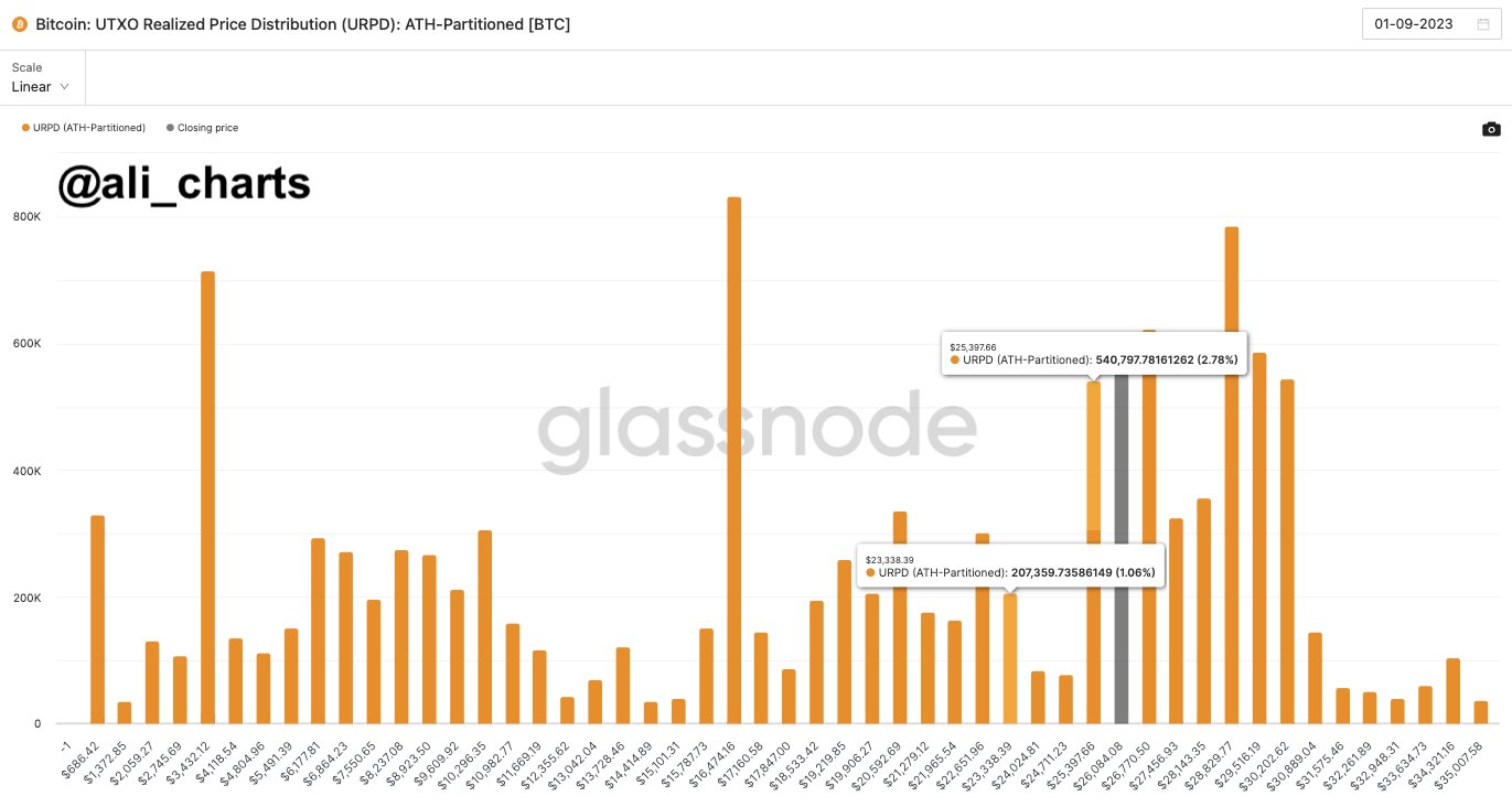“ஆன்-செயின் தரவு $BTC க்கு $25,400 குறிக்கு கீழே வலுவான ஆதரவு இல்லை என்று கூறுகிறது,” பிரபல வர்த்தகர் அலி கூறினார் X (முன்னர் Twitter) சந்தாதாரர்கள்.