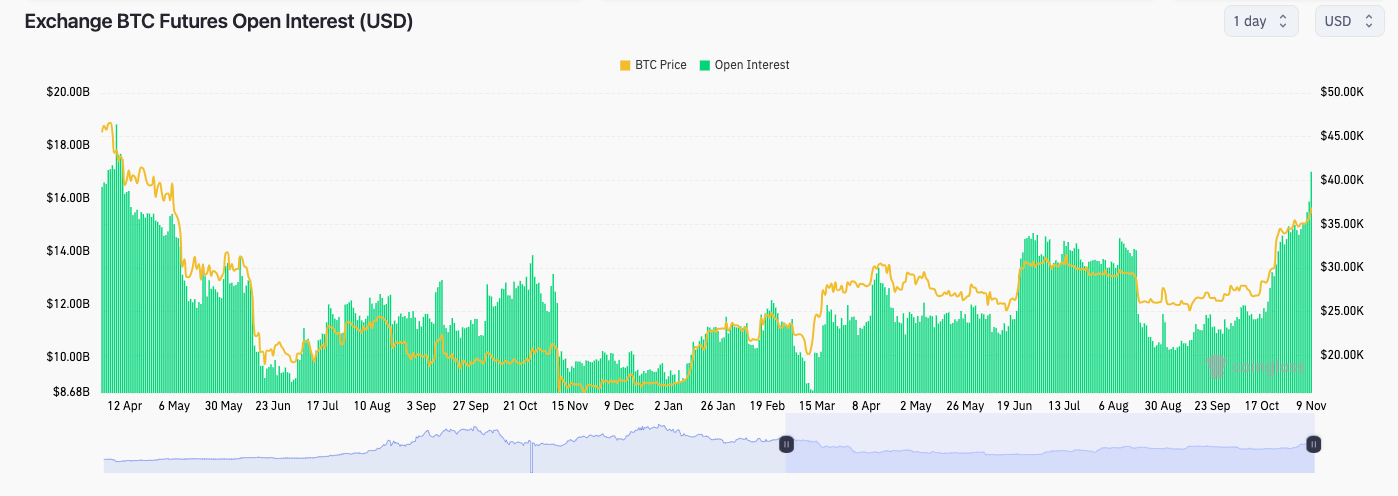 கண்காணிப்பு ஆதாரத்திலிருந்து தரவு ஒன்றுக்கு CoinGlassமொத்த பிட்காயின் எதிர்கால OI எழுதும் நேரத்தில் $17 பில்லியனுக்கும் அதிகமாக இருந்தது – ஏப்ரல் நடுப்பகுதியில் இருந்து அதிக மதிப்பு.