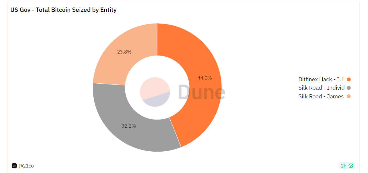 பொதுத் தாக்கல்களை அடிப்படையாகக் கொண்ட தரவுப் பகுப்பாய்வின்படி, கிரிப்டோ நிறுவனம் 21.co மதிப்பிட்டுள்ளது, அமெரிக்க அரசாங்கம் இன்னும் 194,188 BTC ஐ வைத்திருக்கிறது, இதன் மதிப்பு $5.3 பில்லியன் என மதிப்பிடப்பட்டுள்ளது. நிறுவனம் தனது பகுப்பாய்வில் இவை “பொதுவில் கிடைக்கும் தகவல்களின் அடிப்படையில் அமெரிக்க அரசாங்கத்தின் பங்குகளின் கீழ் வரம்பு மதிப்பீடுகள்” என்று குறிப்பிட்டது.