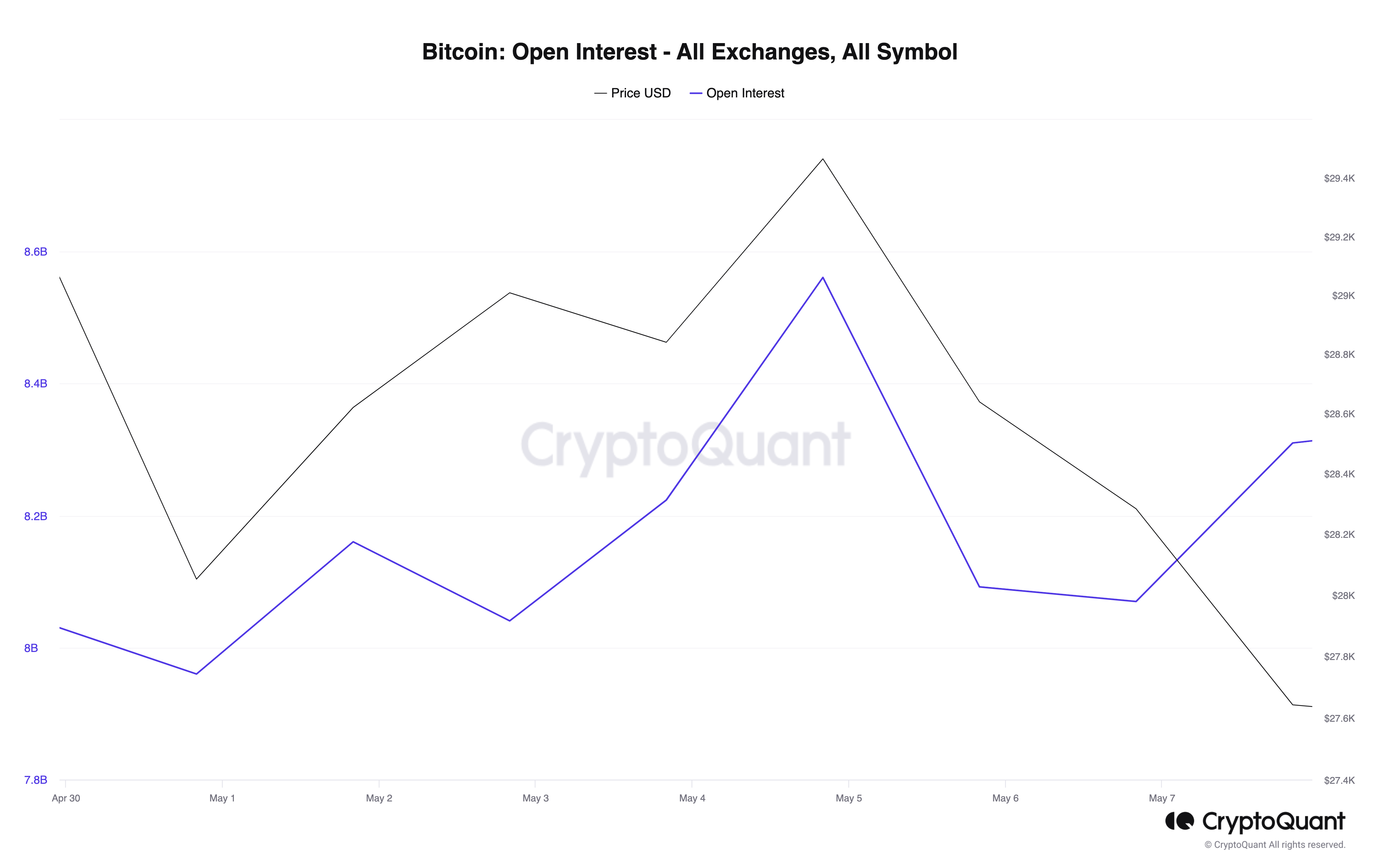 ஒரு குறிப்பிட்ட ஒப்பந்தத்தின் திறந்த வட்டி, பிட்காயின் எதிர்காலங்கள் அல்லது விருப்பங்கள் போன்றவை, திறந்த நிலைகளின் மொத்த எண்ணிக்கையைக் குறிக்கிறது. பிட்காயின் டெரிவேட்டிவ்களில் தற்போது எவ்வளவு பணம் முதலீடு செய்யப்பட்டுள்ளது என்பதற்கான அளவீடு இதுவாகும்.