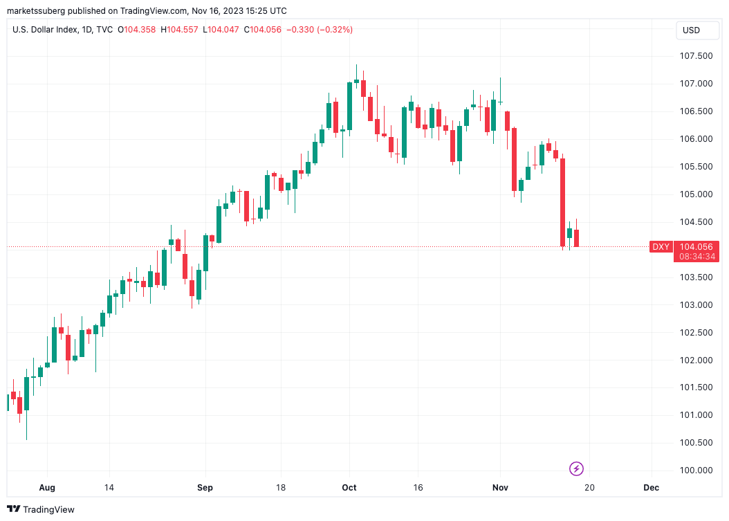 அமெரிக்க டாலர் குறியீடு (DXY) மீண்டும் 104க்கு அருகில் இருந்தது – செப்டம்பர் தொடக்கத்தில் இருந்து அதன் மிகக் குறைந்த நிலைகளுக்கு அருகில்.