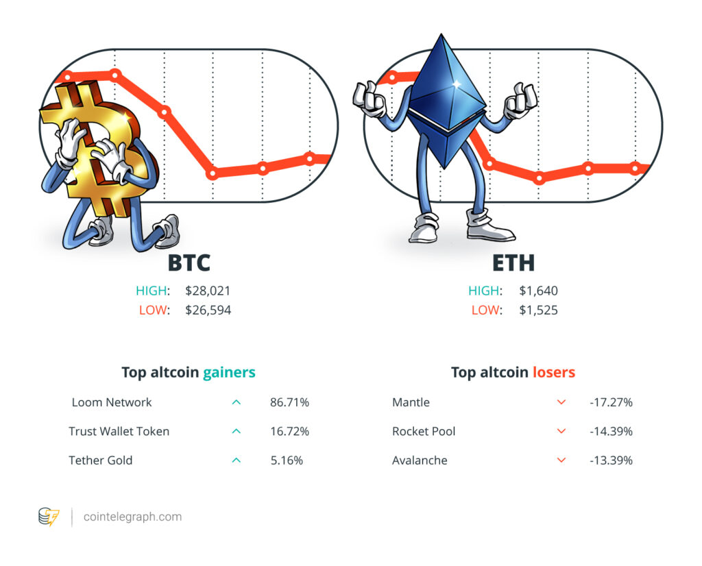 வார இறுதியில், பிட்காயின் (BTC) இல் உள்ளது $26,892ஈதர் (ETH) மணிக்கு $1,551 மற்றும் XRP மணிக்கு $0.48. மொத்த சந்தை மூலதனம் உள்ளது $1.05 டிரில்லியன், படி CoinMarketCap க்கு.