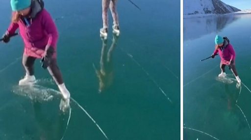முகம் பார்க்கும் கண்ணாடி போன்று காட்சியளிக்கும் ஏரி – ஸ்கேட்டிங் செய்து சாகசம்