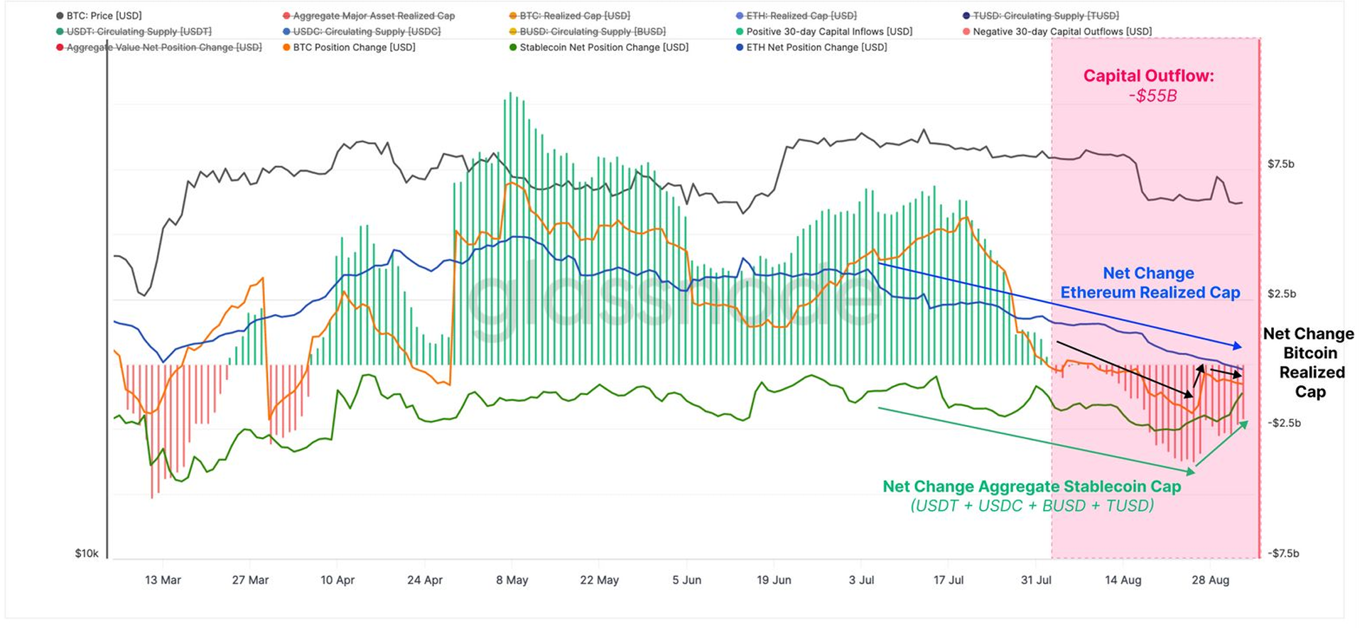கடந்த மாதத்தில் கிரிப்டோ சந்தைகளில் இருந்து சுமார் 55 பில்லியன் டாலர்கள் வெளியேற்றப்பட்ட நிலையில், மூலதன வெளியேற்றம் பிட்காயினை (BTC) மட்டும் பாதிக்கவில்லை, ஆனால் ஈதர் (ETH) மற்றும் ஸ்டேபிள்காயின் பணப்புழக்கத்தையும் பாதித்தது.