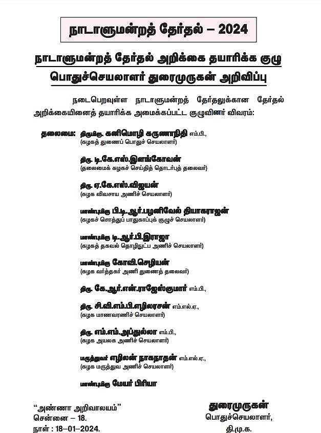 நாடாளுமன்ற தேர்தலுக்கான ‘தேர்தல் அறிக்கை தயாரிப்பு’ குழு நாடாளுமன்ற உறுப்பினர் கனிமொழி தலைமை அறிவிக்கப்பட்டுள்ளது. அக்குழுவில், டி.கே.எஸ் இளங்கோவன், விஜயன், பி.டி.ஆர் பழனிவேல் தியாகராஜன், டி.ஆர்.பி ராஜா, கோவி.செழியன், கே.ஆர்.என் ராஜேஸ்குமார், அப்துல்லா, எழிலன் நாகநாதன், மேயர் பிரியா ஆகியோர் இடம் பெற்றுள்ளார்கள்.