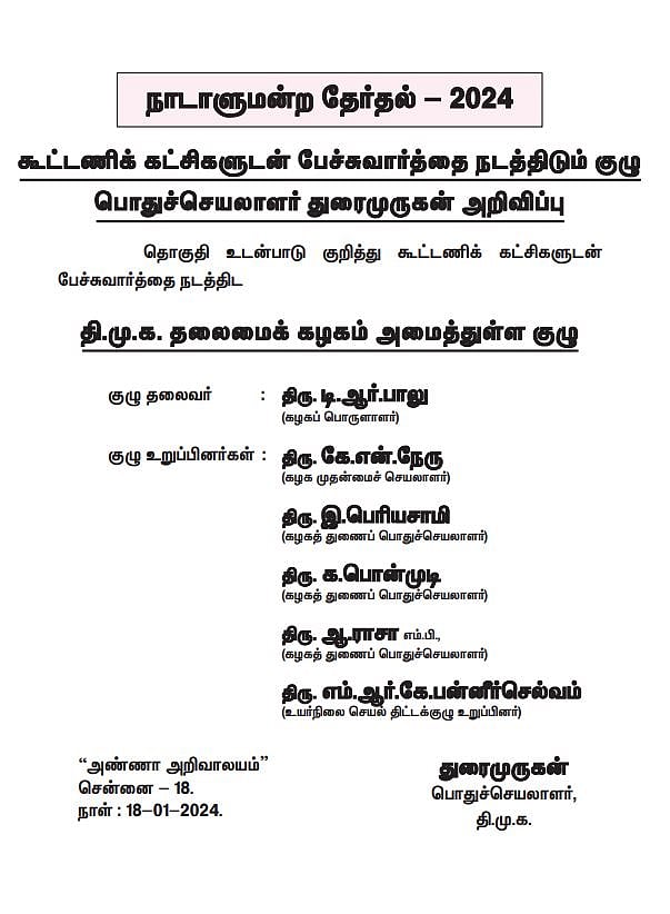 மேலும், கூட்டணி கட்சிகளுடன் பேச்சுவார்த்தை நடத்திட டி.ஆர் பாலு தலைமையில் குழு அமைக்கப்பட்டுள்ளது.