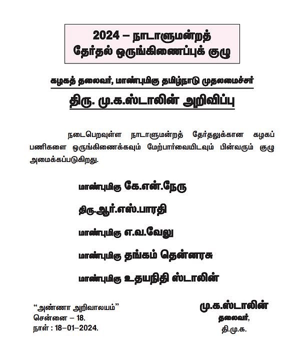 அதே போல, நாடாளுமன்ற தேர்தலுக்கான கட்சி பணிகளை ஒருங்கிணைக்கவும் மேற்பார்வையிடவும் முதல்வர் ஸ்டாலின் குழு அமைத்து இருக்கிறார். அக்குழுவில் கே.என் நேரு, ஆர்.எஸ் பாரதி, எ.வ வேலு, தங்கம் தென்னரசு, உதயநிதி ஸ்டாலின் ஆகியோர் இடம் பிடித்துள்ளனர்.