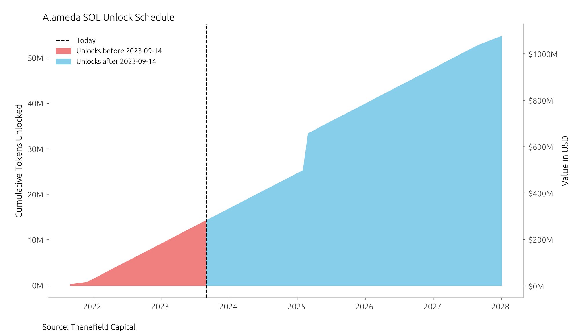 FTX இன் SOL ஸ்டேக்கிங் அன்லாக் அட்டவணையைப் பார்க்கும்போது, இந்த டோக்கன்களின் குறிப்பிடத்தக்க பகுதியானது லீனியர் வெஸ்டிங் அல்லது திட்டமிடப்பட்ட அன்லாக் மூலம் 2028 ஆம் ஆண்டு வரை மெதுவாக சந்தைக்கு வரும், மிகப்பெரிய அன்லாக் மார்ச் 2025 இல் திட்டமிடப்பட்டுள்ளது. பெரும்பாலான SOL ஸ்டாக்கிங் ஒப்பந்தங்களில் பூட்டப்பட்டுள்ளது.