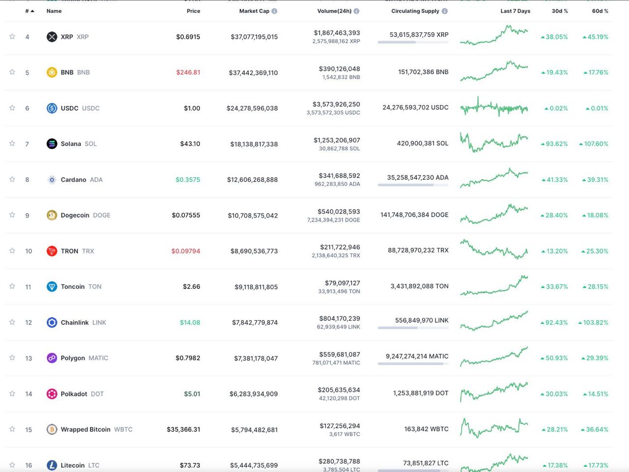 SOL ஐப் போலவே, செயின்லிங்கின் LINK (LINK) ஆனது சீரான கட்டிடம் மற்றும் பயன்பாட்டின் காரணமாக 100%க்கும் அதிகமான 60 நாள் வருமானத்தைப் பெற்றுள்ளது. LINK ஆனது ஆறு நாட்களில் 26% வருமானத்தை பதிவு செய்துள்ளது.