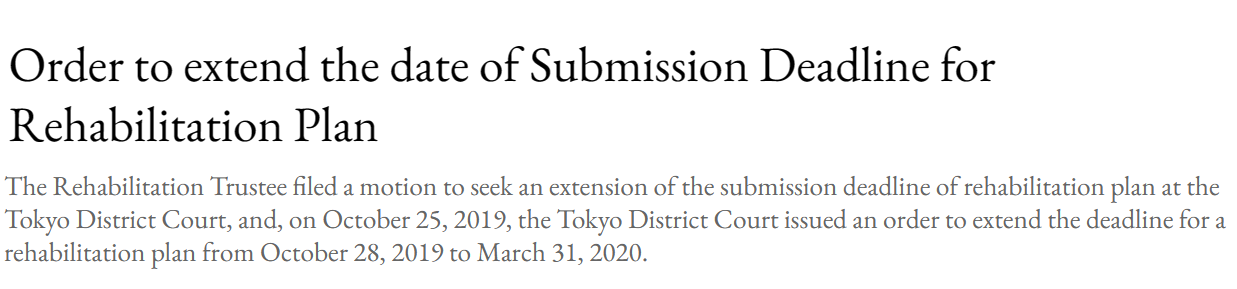 இருப்பினும், புனர்வாழ்வுத் திட்டத்தைச் சமர்ப்பிப்பதற்கான காலக்கெடுவை நீட்டிக்குமாறு டோக்கியோ நீதிமன்றத்தை மவுண்ட் கோக்ஸ் கோரினார். அக்டோபர் 25, 2019 அன்று, டோக்கியோ மாவட்ட நீதிமன்றம் மறுவாழ்வுத் திட்டத்திற்கான காலக்கெடுவை அக்டோபர் 28, 2019 முதல் மார்ச் 31, 2020 வரை நீட்டித்து உத்தரவு பிறப்பித்தது.