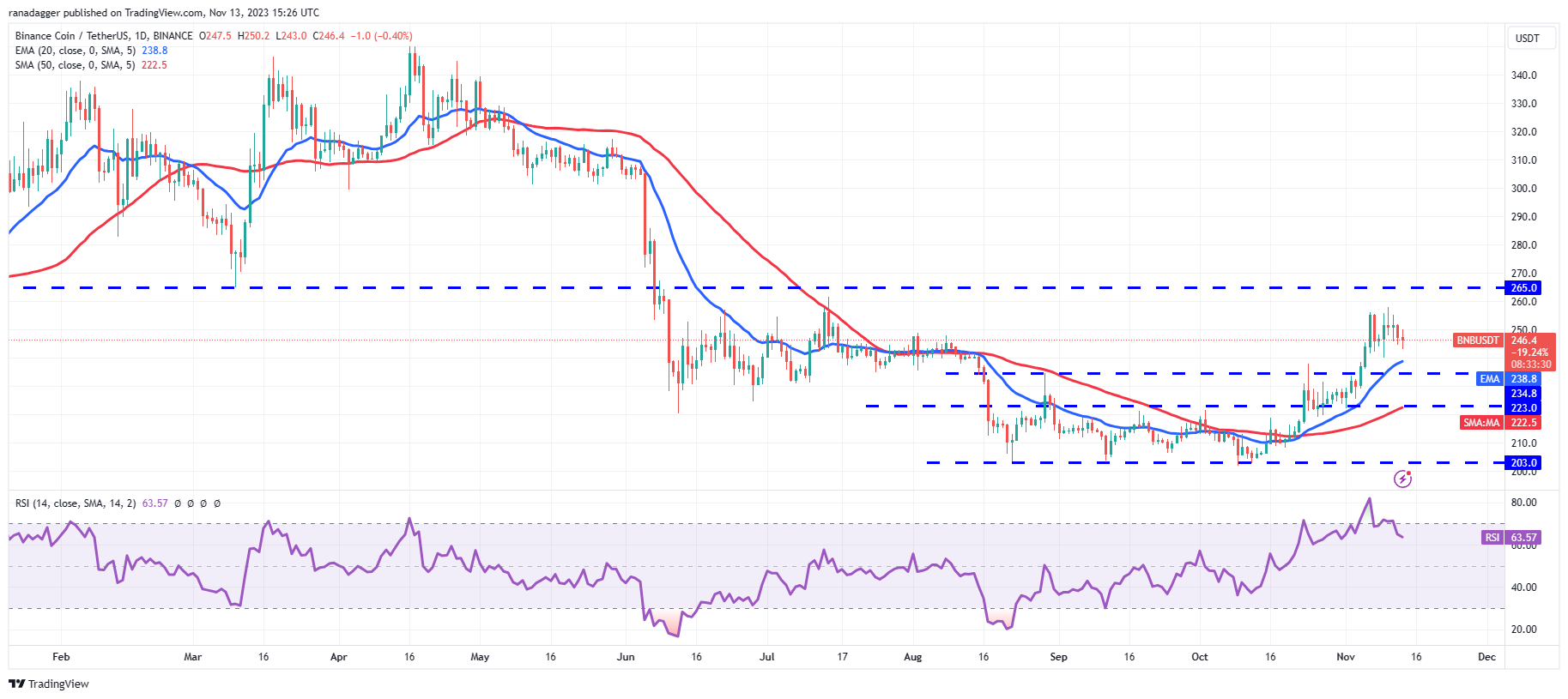 20 நாள் EMA ($238) மற்றும் நேர்மறை பிரதேசத்தில் உள்ள RSI ஆகியவை வாங்குபவர்களுக்கு ஒரு நன்மையைக் குறிக்கின்றன. 20-நாள் EMA இல் விலை உயர்ந்தால், காளைகள் BNB/USDT ஜோடியை $265க்கு உயர்த்த முயற்சிக்கும். இந்த நிலை மீண்டும் காளைகளுக்கும் கரடிகளுக்கும் இடையே கடுமையான போருக்கு சாட்சியாக இருக்கலாம், ஆனால் அழிக்கப்பட்டால், இந்த ஜோடி $285 ஆக உயரக்கூடும்.