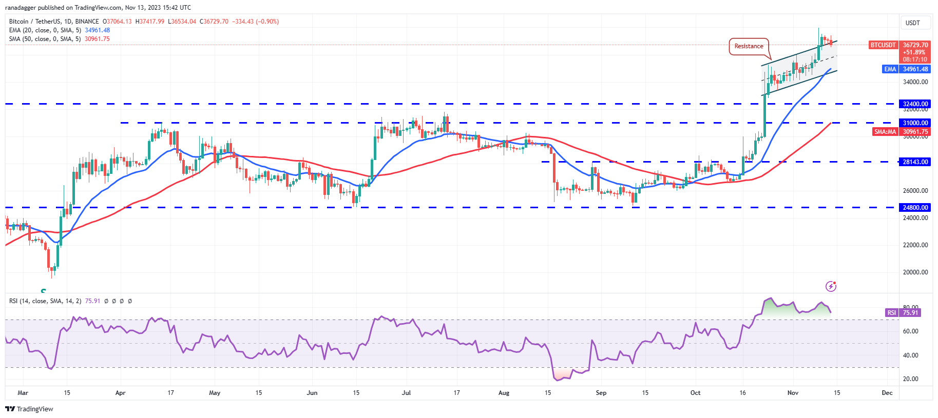 சேனலின் உள்ளே விலை மீண்டும் நுழைந்தால், நவம்பர் 9 அன்று நடந்த பிரேக்அவுட் ஒரு காளைப் பொறியாக இருக்கலாம் என்று பரிந்துரைக்கும். குறுகிய கால வர்த்தகர்கள் லாபத்தை முன்பதிவு செய்யலாம், விலையை 20-நாள் EMA ($34,961) நோக்கி இழுக்கலாம்.