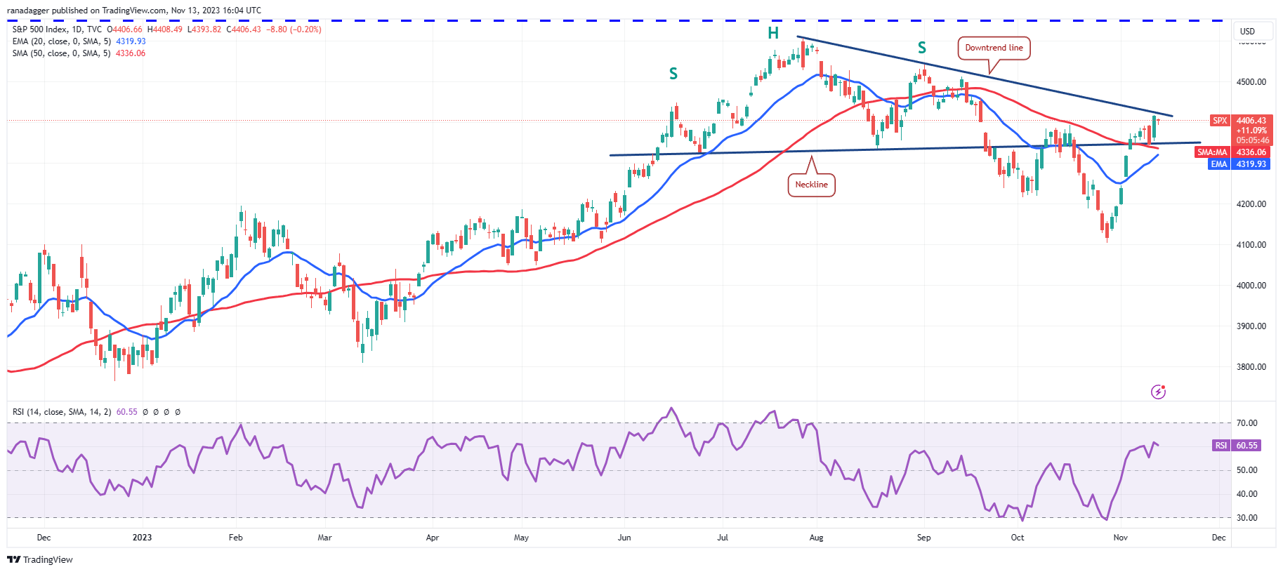 S&P 500 இன்டெக்ஸ் (SPX) நவம்பர் 9 அன்று நெக்லைனில் இருந்து பின்வாங்கியது, இது காளைகள் ஒவ்வொரு சிறிய சரிவின் போதும் வாங்குவதைக் குறிக்கிறது.