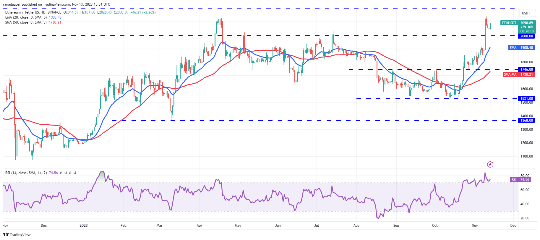 ஈதர் (ETH) நவம்பர் 12 அன்று $2,000 என்ற உளவியல் நிலையை மீட்டெடுத்தது, இது காளைகள் ஆதரவாக நிலை புரட்ட முயற்சிப்பதைக் குறிக்கிறது.