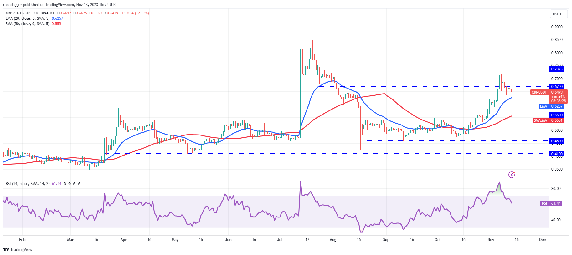 XRP (XRP) கடந்த சில நாட்களாக $0.67க்குக் கீழே வர்த்தகமாகி வருகிறது, ஆனால் காளைகள் 20-நாள் EMA ($0.62)க்குக் கீழே விலை சறுக்க அனுமதிக்கவில்லை என்பது சாதகமான அறிகுறியாகும்.