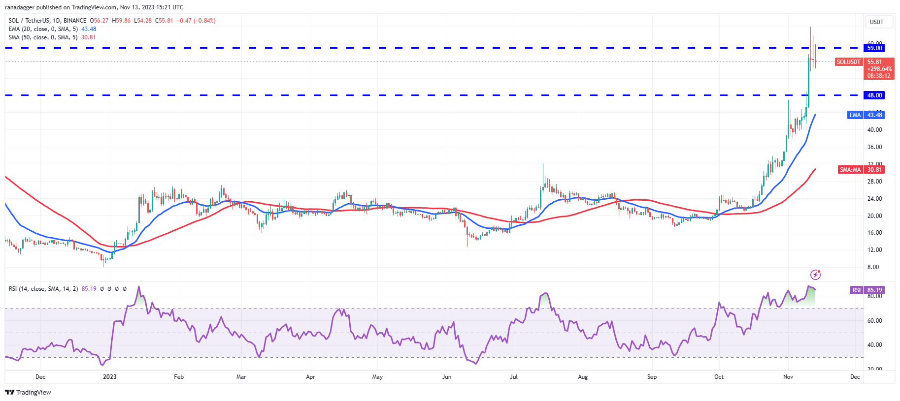நவம்பர் 10 அன்று சோலனா (SOL) $48 எதிர்ப்பை விட உயர்ந்தது மற்றும் நவம்பர் 11 அன்று $59 அளவை எட்டியது, ஆனால் காளைகள் கரடிகளிடமிருந்து கடுமையான எதிர்ப்பை எதிர்கொள்கின்றன.