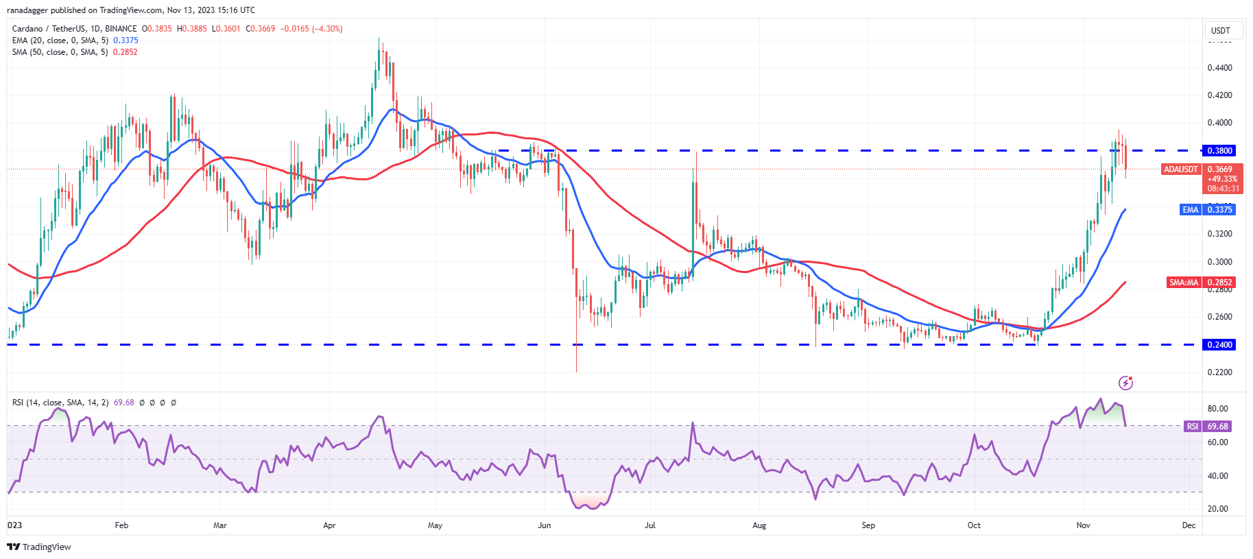 மாற்றாக, விலை தொடர்ந்து குறைந்து, 20-நாள் EMAக்குக் கீழே சரிந்தால், ADA/USDT ஜோடி $0.24 மற்றும் $0.38 இடையே பெரிய வரம்பிற்குள் சிறிது நேரம் செலவழிக்கக்கூடும் என்பதைக் குறிக்கும்.
