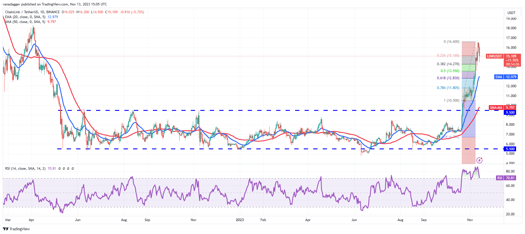 நவம்பர் 12 அன்று $16.60க்கு அருகில் லாபத்தை பதிவு செய்ய குறுகிய கால வர்த்தகர்களை தூண்டியிருக்கலாம். LINK/USDT ஜோடியானது 38.2% Fibonacci retracement level of $14.27 க்கும், 50% retracement level of $13.55க்கும் திரும்பப் பெறலாம்.