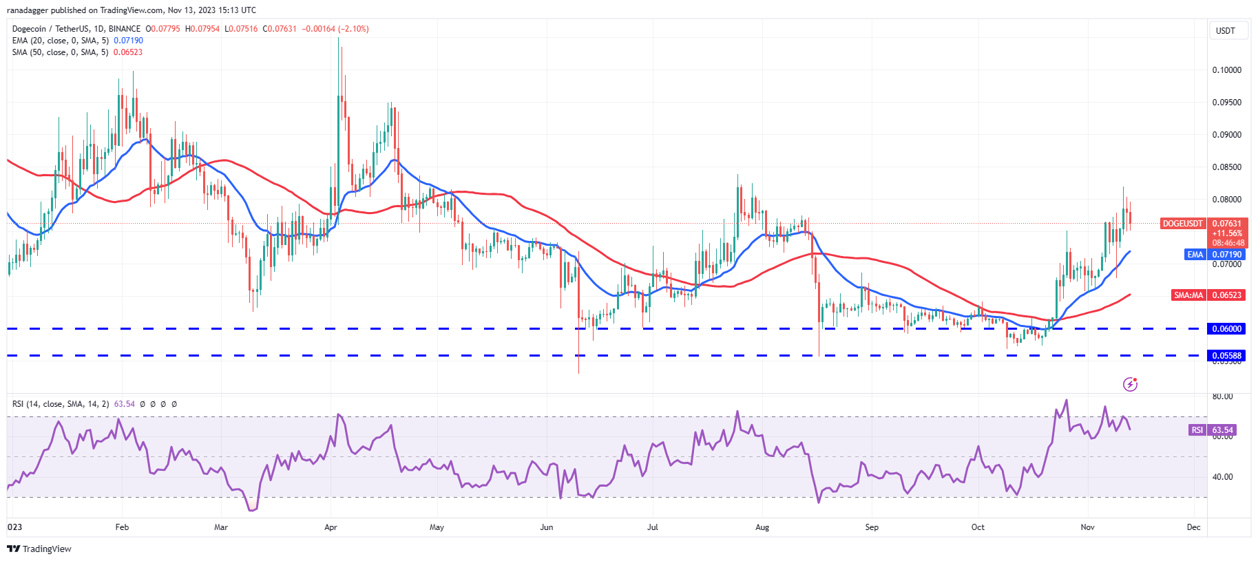 நவம்பர் 11 அன்று Dogecoin (DOGE) $0.08க்கு மேல் உயர்ந்தது, ஆனால் அன்றைய மெழுகுவர்த்தியில் நீண்ட திரியில் இருந்து பார்க்கும் போது காளைகளால் உயர்ந்த நிலைகளைத் தக்கவைக்க முடியவில்லை.