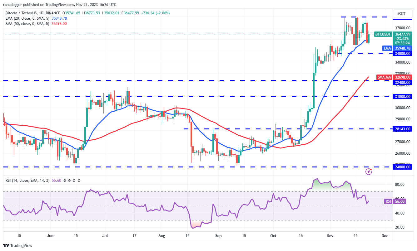 கரடிகள் நவம்பர் 21 அன்று 20-நாள் அதிவேக நகரும் சராசரிக்கு ($35,948) கீழே பிட்காயினை இழுத்தன, ஆனால் குறைந்த அளவைத் தக்கவைக்க முடியவில்லை. காளைகளின் வலுவான கொள்முதல் நவம்பர் 22 அன்று 20 நாள் EMA ஐ விட விலையை பின்னுக்குத் தள்ளியது.
