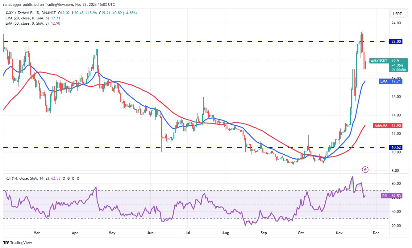 நவம்பர் 19 அன்று பனிச்சரிவு (AVAX) $10.52 முதல் $22 வரையிலான வரம்பிற்கு மேல் மூடப்பட்டது, ஆனால் காளைகளால் அதிக அளவுகளை பராமரிக்க முடியவில்லை. கரடிகள் நவம்பர் 20 அன்று பிரேக்அவுட் நிலைக்கு கீழே விலையை இழுத்தன.