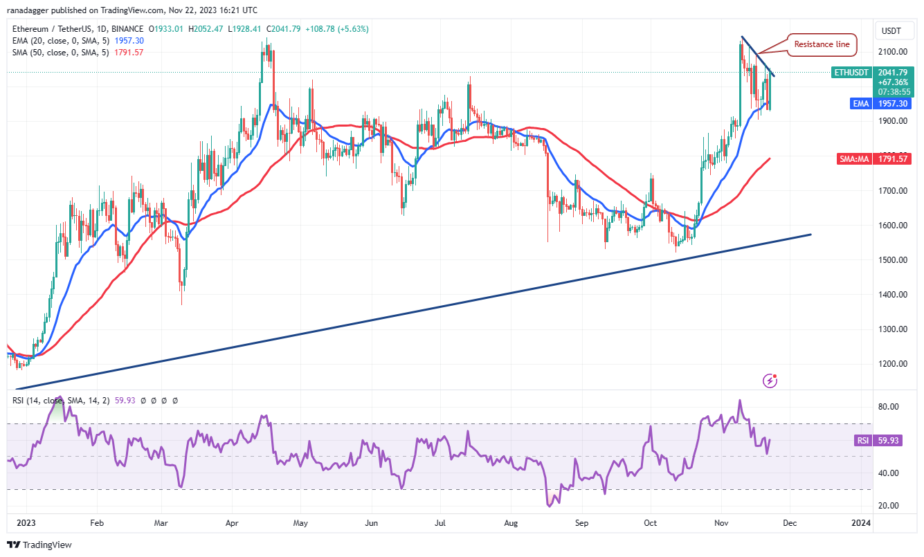 ஈதர் (ETH) நவம்பர் 20 அன்று எதிர்ப்புக் கோட்டிலிருந்து நிராகரிக்கப்பட்டது மற்றும் நவம்பர் 21 அன்று 20-நாள் EMA ($1,957) க்கு கீழே சரிந்தது.