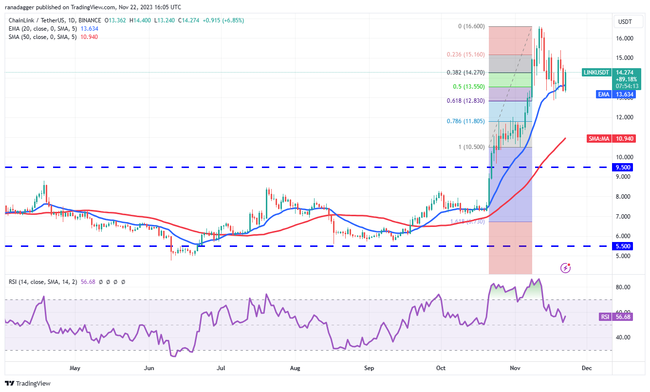 நவம்பர் 20 அன்று $15.39 என்ற உடனடி எதிர்ப்பிலிருந்து செயின்லிங்க் (LINK) நிராகரிக்கப்பட்டு நவம்பர் 21 அன்று 20-நாள் EMA ($13.63)க்குக் கீழே சரிந்தது.
