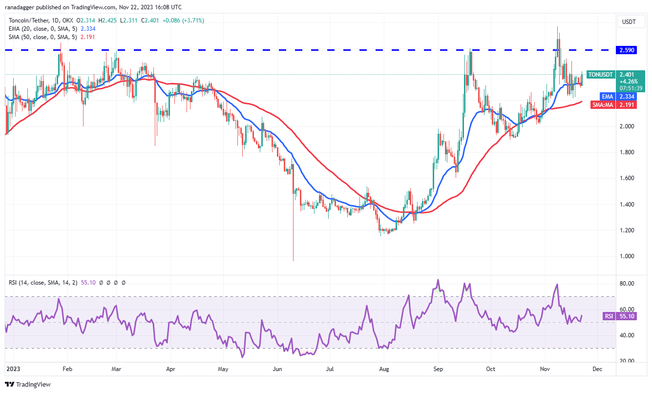 நகரும் சராசரிகள் இரண்டும் சமமாக இருக்கும், மேலும் RSI நடுப்புள்ளிக்கு சற்று மேலே உள்ளது, இது குறுகிய காலத்தில் வரம்புக்கு உட்பட்ட செயலைக் குறிக்கிறது. விலை $2.40க்கு மேல் இருந்தால், TON/USDT ஜோடி $2.59 ஆக உயரலாம்.