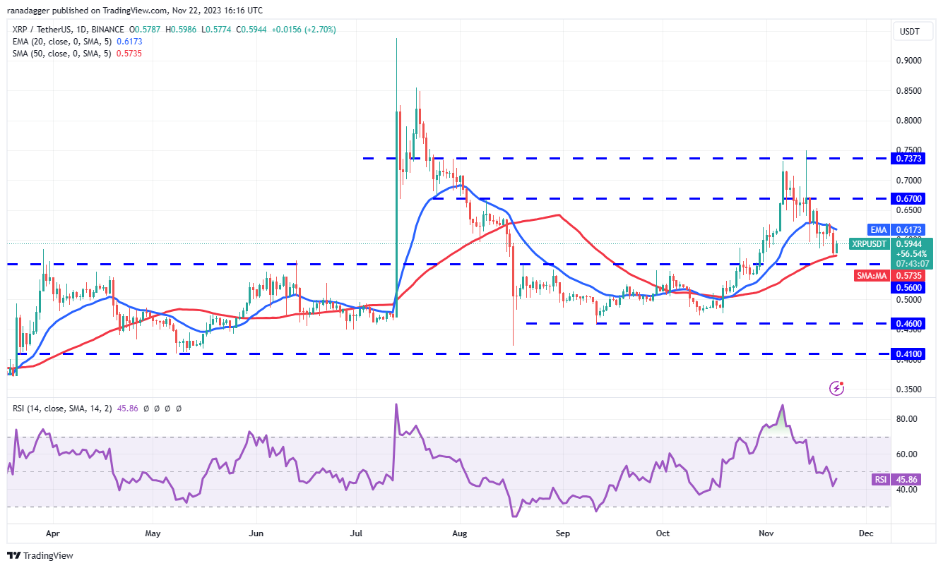 XRP (XRP) நவம்பர் 20 அன்று 20-நாள் EMA ($0.61) இல் இருந்து நிராகரிக்கப்பட்டு நவம்பர் 21 அன்று 50-நாள் SMA ($0.57) ஆக குறைந்தது.