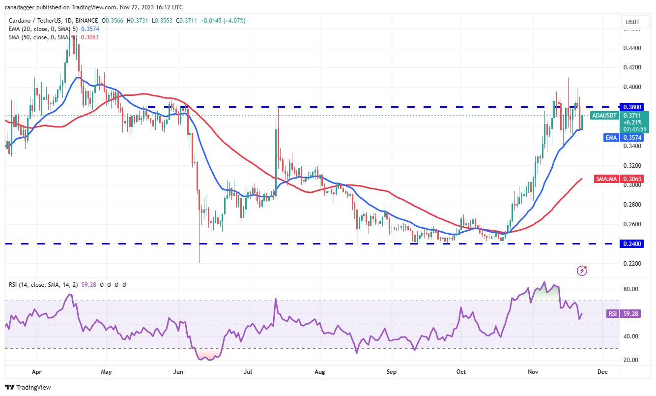 $0.38 என்ற பிரேக்அவுட் லெவலுக்கு மேல் கார்டானோவை (ADA) பராமரிக்க காளைகள் மீண்டும் மீண்டும் தோல்வியடைந்ததால், நவம்பர் 21 அன்று ஒரு திருத்தம் தொடங்கியது.
