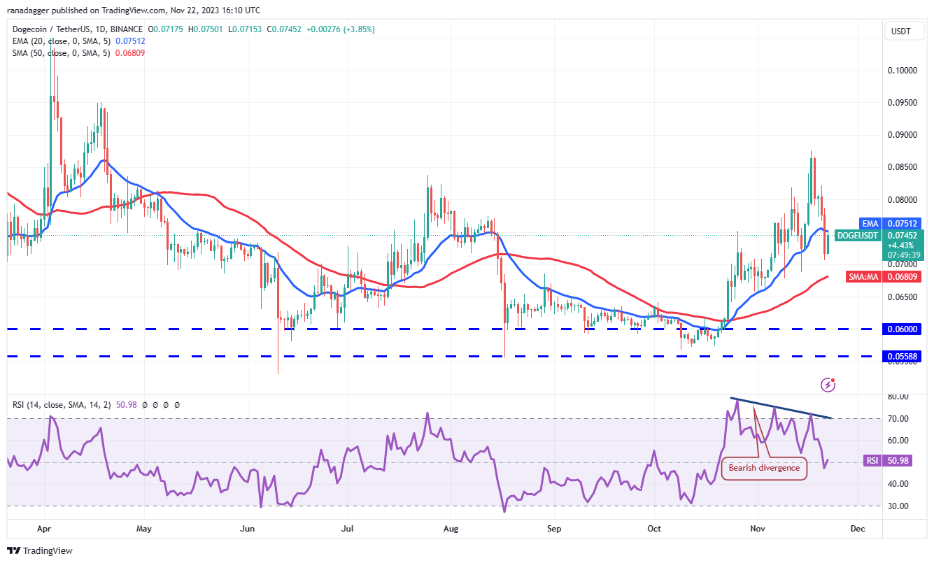 Dogecoin (DOGE) நவம்பர் 21 அன்று 20-நாள் EMA ($0.07) க்குக் கீழே சரிந்தது, ஆனால் கரடிகள் கீழ் நிலைகளைத் தக்கவைக்கப் போராடுகின்றன.
