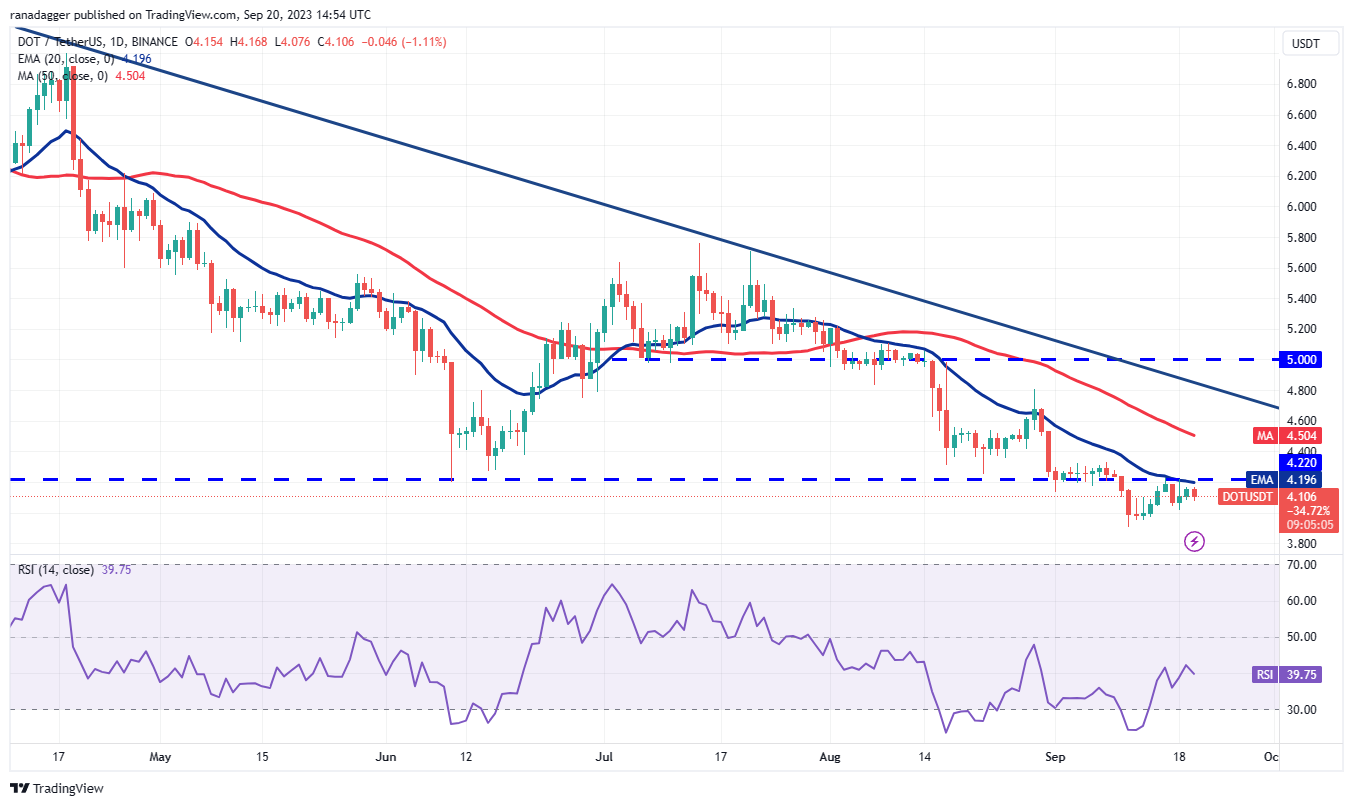 கரடிகள் $4க்கு உடனடி ஆதரவுக்குக் கீழே விலையை மூழ்கடித்து தங்கள் நிலையை வலுப்படுத்த முயற்சிக்கும். அவர்கள் வெற்றி பெற்றால், DOT/USDT ஜோடி $3.90க்கு முக்கியமான ஆதரவை அடையும். இந்த நிலைக்குக் கீழே ஒரு இடைவெளி மற்றும் மூடல் கீழ்நிலையின் அடுத்த கட்டத்தைத் தொடங்கலாம்.