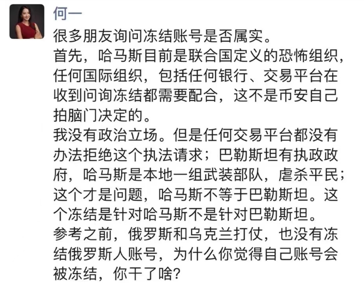 “ஹமாஸ் ஐக்கிய நாடுகள் சபையால் நியமிக்கப்பட்ட பயங்கரவாத அமைப்பாகும். எனவே, வங்கிகள் மற்றும் வர்த்தக தளங்கள் உட்பட எந்தவொரு நிறுவனமும் முடக்க கோரிக்கைகளைப் பெறுவதற்கு ஒத்துழைக்க வேண்டும். இது பைனான்ஸ் சொந்தமாக முடிவெடுக்கக்கூடிய ஒன்றல்ல.