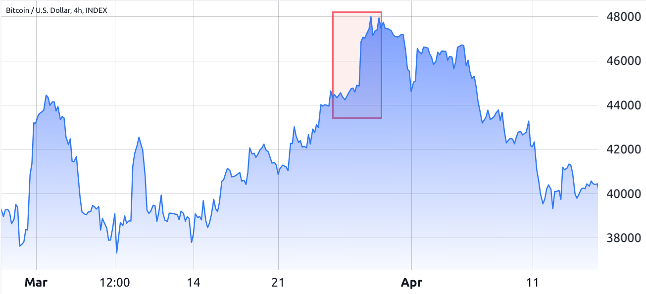 MicroStrategy இன் கையகப்படுத்துதலின் போது விலை நடவடிக்கையின் இரண்டு குறிப்பிடத்தக்க அம்சங்கள் தனித்து நிற்கின்றன. முதலாவதாக, ஏப்ரல் 5, 2022 அன்று அதிகாரப்பூர்வ அறிவிப்பு வெளியிடப்பட்ட அதே நாளில் $46,000க்குக் கீழே விலை குறைந்தது. மிக முக்கியமாக, $48,000 உச்சநிலையானது MicroStrategy அதன் செயல்பாட்டினை நிறைவு செய்த நிலைகளுக்கு ஒத்ததாகத் தோன்றுகிறது, இதன் விளைவாக $45,714 சராசரி விலை கிடைத்தது.