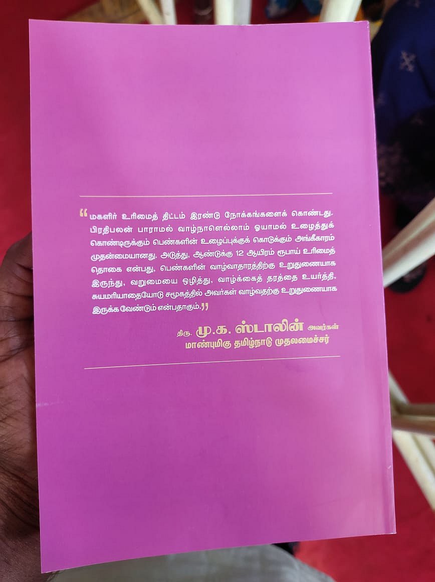 கூட்டத்தில் கலந்து கொண்டவர்களுக்கு இந்த திட்டம் குறித்த கையேடு ஒன்றும் வழங்கப்பட்டுள்ளது. அதில், பணத்தை சேமிப்பது குறித்த தகவல்கள் குறிப்பிடப்பட்டுள்ளது. இந்த கையேடுவில் முதல்வர் ஸ்டாலின், “ மகளிர் உரிமை திட்டம் இரண்டு நோக்கங்களைக் கொண்டது. பிரதிபலன் பாராமல் வாழ்நாளெல்லாம் ஓயாமல் உழைத்துக் கொண்டிருக்கும் பெண்களின் உழைப்புக்கு கொடுக்கும் அங்கீகாரம் முதன்மையானது. அடுத்த ஆண்டுக்கு 12 ஆயிரம் ரூபாய் உரிமை தொகை என்பது, பெண்களின் வாழ்வாதாரத்துக்கு உறுதுணையாக இருந்து, வறுமையை ஒழித்து, வாழ்க்கை தரத்தை உயர்த்தி, சுயமரியாதையோடு சமூகத்தில் அவர்கள் வாழ்வதற்கு உறுதுணையாக இருக்க வேண்டும்” என்பது ஆகும் என குறிப்பிட்டுள்ளார்.