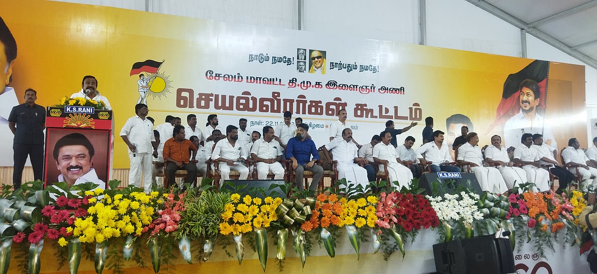 சேலம், சீலநாயக்கன்பட்டி பகுதியில் மாவட்ட தி.மு.க இளைஞரணி செயல்வீரர்கள் கூட்டம் நடைபெற்றது. இதில், தி.மு.க இளைஞரணிச் செயலாளர் உதயநிதி ஸ்டாலின் கலந்துகொண்டு சிறப்புரையாற்றினார். அப்போது பேசிய அவர், “பா.ஜ.க-வின் ஒன்பது ஆண்டுக்கால ஆட்சியில், பிரதமர் மோடி `மாற்றத்தைக் கொண்டு வருவேன்’ என்று கூறி, `இந்தியா’ என்ற பெயரை மட்டும் மாற்றி `பாரதம்’ என்று கொண்டுவந்திருக்கிறார். தி.மு.க இளைஞரணி மாநாட்டை வெற்றிகரமாக நடத்த வேண்டும். அதற்கு அடித்தளமாக அமைந்திருப்பது இளைஞர் அணிதான், தலைமை சொல்வதை செய்து காட்டுபவர்கள்தான் செயல்வீரர்கள்.
