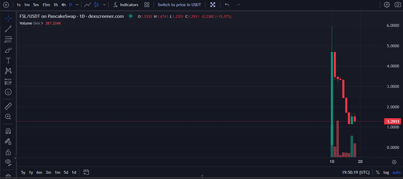 DEX Screener இன் தரவு, FSL இன் விலை ஆரம்பத்தில் அக்டோபர் 10 அன்று காலை 6:30 UTC மணிக்கு ஒரு டோக்கனுக்கு $0.3911 என நிர்ணயிக்கப்பட்டது. அடுத்த சில மணிநேரங்களில், அது $17.5774 ஆக உயர்ந்தது, பின்னர் இந்த உச்சத்திலிருந்து பின்வாங்கி, அடுத்த சில மணிநேரங்களுக்கு சுமார் $5க்கு நிலையாக வந்தது. பின்னர், மாலை 4:30 மணி முதல் 5:00 மணி வரை யுடிசியின் விலை திடீரென உயர்ந்தது சரிந்ததுதோராயமாக $5 இலிருந்து பூஜ்ஜியத்திற்கு அருகில் உள்ளது.