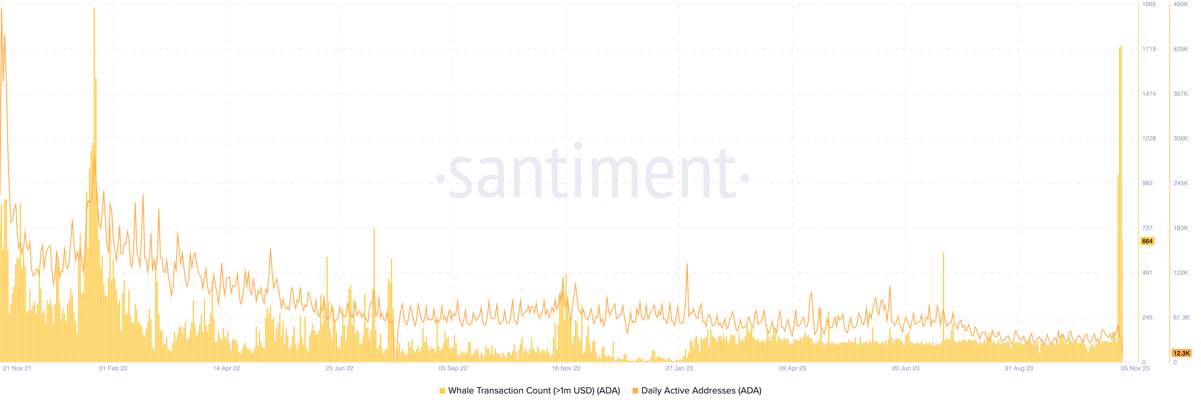மதிப்பீட்டில் $1 மில்லியனுக்கும் அதிகமான பரிவர்த்தனைகளின் எண்ணிக்கை நவம்பர் 4 அன்று 1742 ஆக உயர்ந்தது, இது ஜனவரி 2022 க்குப் பிறகு மிக அதிகமாக இருந்தது என்று ஆன்-செயின் டேட்டா ரிசோர்ஸ் சான்டிமென்ட் தெரிவித்துள்ளது. ADA இன் தினசரி செயலில் உள்ள முகவரிகளின் வீழ்ச்சியுடன் இந்த எழுச்சி ஏற்பட்டது.