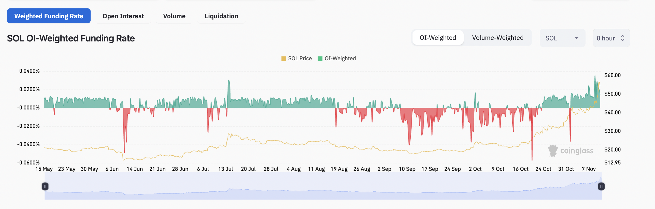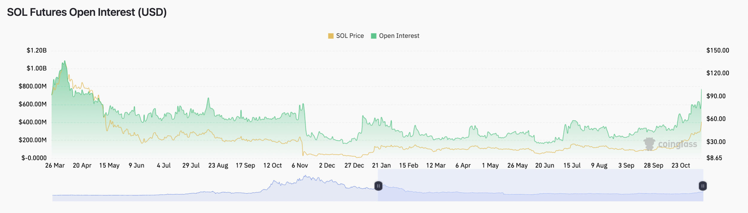 நவம்பர் 11 அன்று சோலானாவின் எதிர்காலத் திறந்த வட்டி கணிசமான அளவு $772 மில்லியனை எட்டியது, இது நவம்பர் 2021க்குப் பிறகு அதிகபட்சமாக, SOL இன் விலை அதன் சாதனையான $260ஐ நிறுவியது. அதிக திறந்த வட்டி நிலைகள் சந்தையில் அதிக வட்டி மற்றும் அதிக பணப்புழக்கத்தைக் குறிக்கின்றன