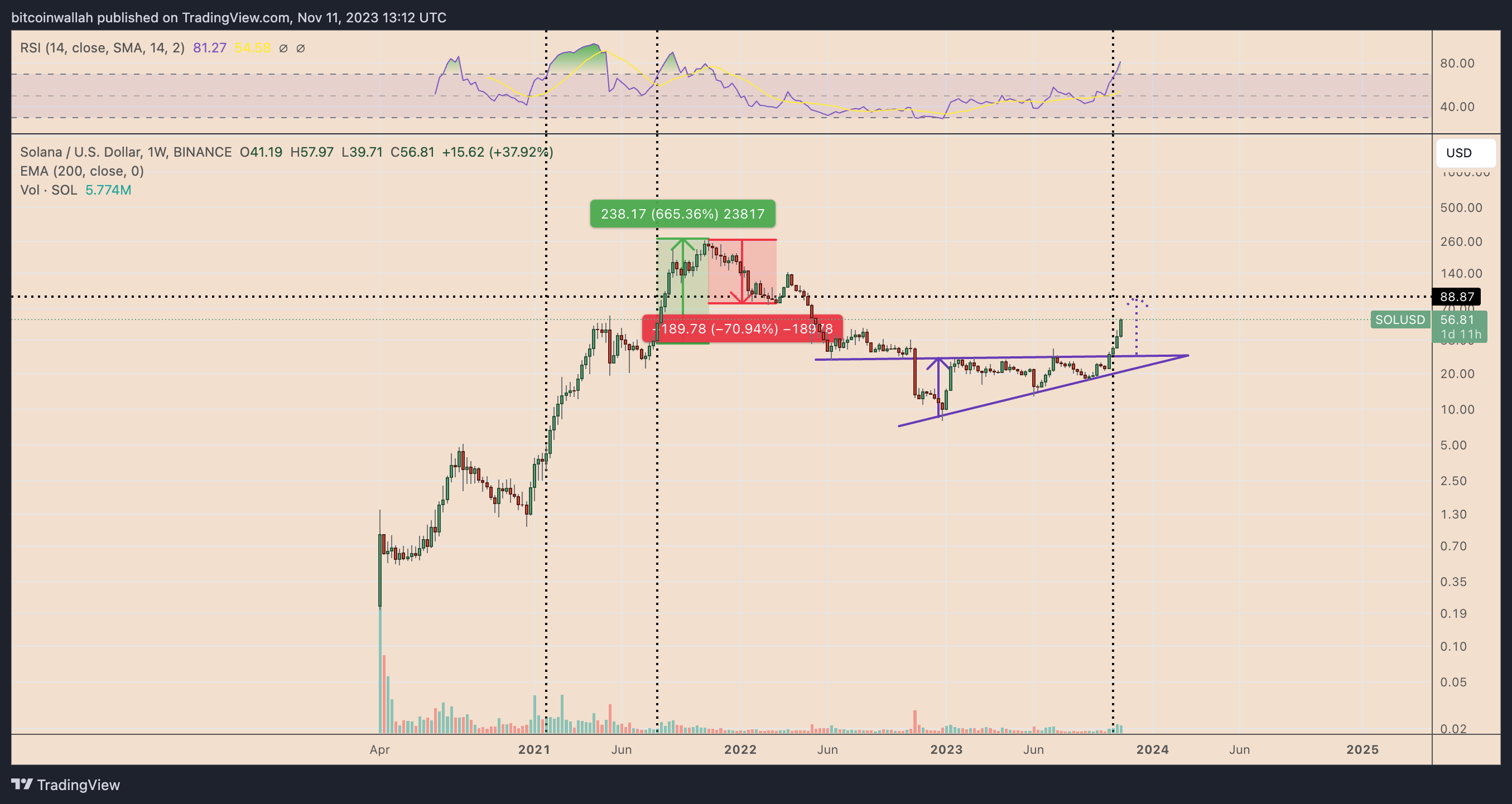 சொலனாவின் (SOL) விலை இந்த வாரம் 40% உயர்ந்து புதிய 2023 இல் $58 ஆக உயர்ந்துள்ளது.