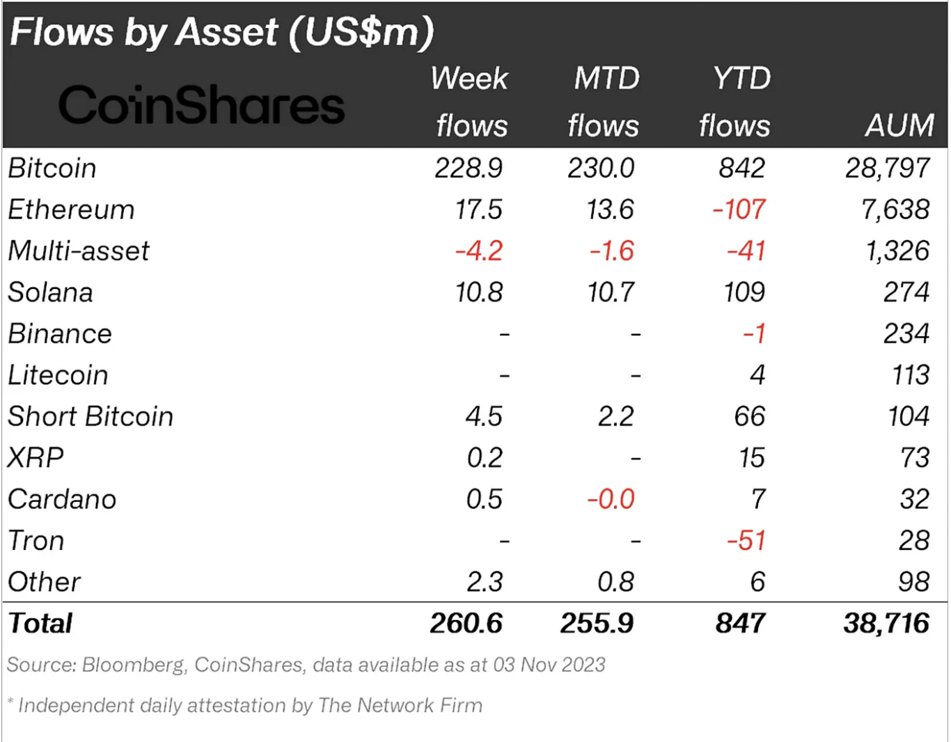 உதாரணமாக, SOL சந்தையில் நிறுவன ஓட்டங்களை அளவிடுவதற்கான காற்றழுத்தமானிகளில் ஒன்றான சோலனா-ஃபோகஸ்டு ஃபண்டுகள், சாட்சியமளித்தார் CoinShares இன் படி, நவம்பர் 3 ஆம் தேதியுடன் முடிவடைந்த வாரத்தில் $10.80 மில்லியன் மதிப்புள்ள வரவுகள்.