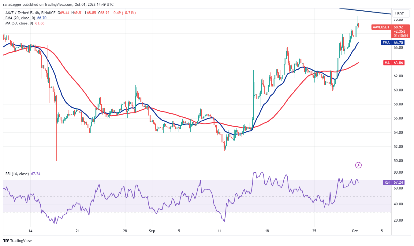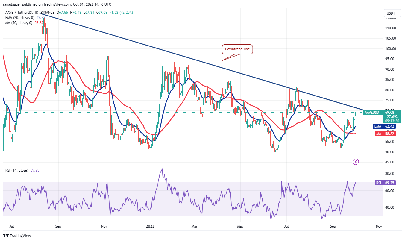 Aave (AAVE) நீண்ட கால கீழ்நிலைக் கோட்டிற்கு மேலே செல்ல முயற்சிக்கிறது, இது சாத்தியமான போக்கு மாற்றத்தைக் குறிக்கிறது. செப். 28 அன்று 20-நாள் EMA ($62.42) திரும்பப் பெறுவது, பேரணிகளில் விற்பதில் இருந்து டிப்ஸில் வாங்கும் மனநிலையில் ஏற்பட்ட மாற்றத்தைக் குறிக்கிறது.