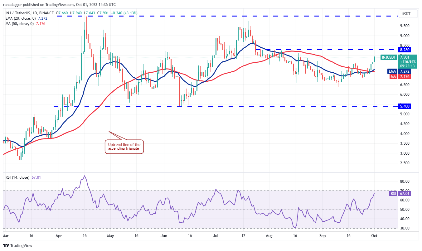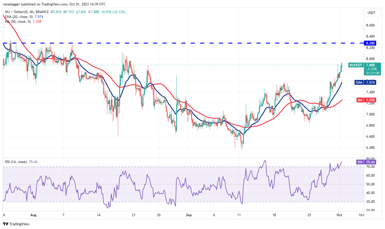 நகரும் சராசரிகள் ஒரு நேர்மறை கிராஸ்ஓவரை நிறைவு செய்துள்ளன மற்றும் RSI நேர்மறையான பிரதேசத்தில் உள்ளது, இது காளைகள் மேல் கையை கொண்டுள்ளது என்பதைக் குறிக்கிறது. INJ/USDT ஜோடி முதலில் $8.28 ஆக உயரலாம், அங்கு கரடிகள் வலுவான எதிர்ப்பை ஏற்றலாம். காளைகள் இந்தத் தடையைத் தாண்டினால், இந்த ஜோடி வேகத்தை அதிகரித்து $10ஐ நோக்கி உயரும்.