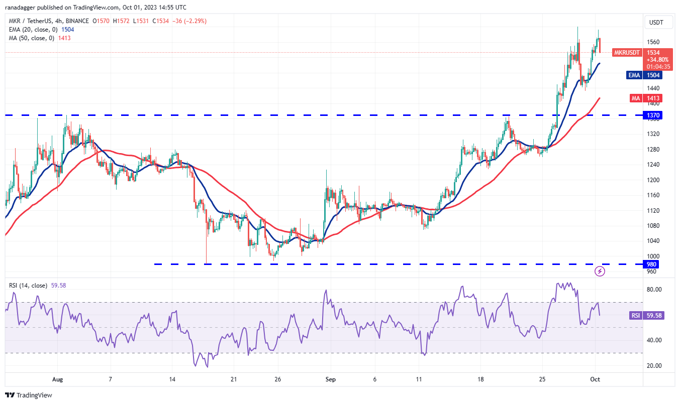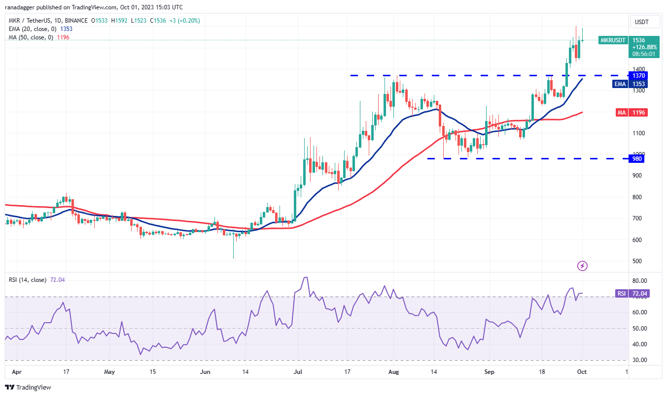 மேக்கர் (எம்கேஆர்) செப்டம்பர் 26 அன்று $1,370க்கு மேல் உடைந்து மூடப்பட்டது, இது ஒரு புதிய ஏற்றத்தின் தொடக்கத்தைக் குறிக்கிறது. ஒரு சொத்து ஏற்றத்தில் இருக்கும் போது, வர்த்தகர்கள் சரிவில் வாங்க முனைகின்றனர்.