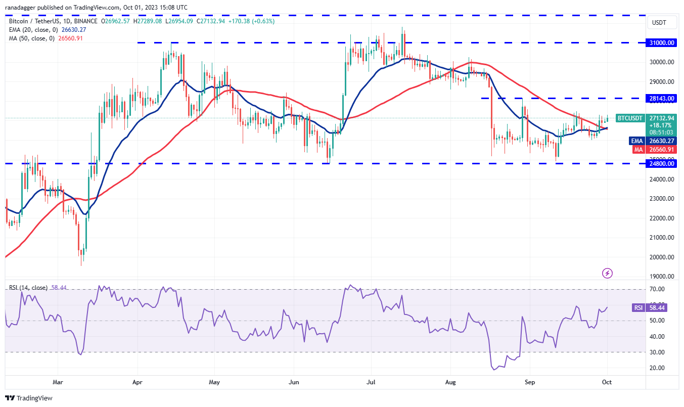 கரடிகள் $27,500 க்கு அருகில் பேரணியை நிறுத்த முயல்கின்றன ஆனால் காளைகள் அதிக இடத்தை விட்டு கொடுக்கவில்லை. ஒவ்வொரு சிறிய டிப்பும் வாங்கப்படுவதை இது காட்டுகிறது. இது $27,500க்கு மேல் இடைவேளையின் வாய்ப்புகளை அதிகரிக்கிறது. BTC/USDT ஜோடியானது முக்கியமான மேல்நிலை எதிர்ப்பை $28,143 இல் மறுபரிசீலனை செய்யலாம். இந்த நிலை மீண்டும் கரடிகளின் ஆக்கிரமிப்பு விற்பனையை ஈர்க்கக்கூடும்.