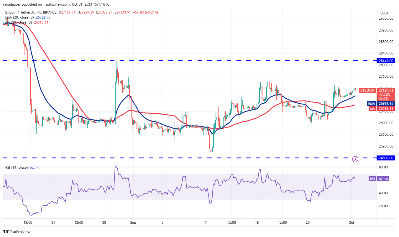 20-EMA இல் இந்த ஜோடி ஆதரவைப் பெறுகிறது என்பதை 4-மணிநேர விளக்கப்படம் காட்டுகிறது. காளைகள் பொறுப்பேற்க முயல்வதை இது குறிக்கிறது. இருப்பினும், கரடிகள் எளிதில் கைவிட வாய்ப்பில்லை, மேலும் அவை $27,300 மற்றும் $27,500 இடையே மண்டலத்தில் மீட்பு நிறுத்த முயற்சிக்கும். விற்பனையாளர்கள் கட்டுப்பாட்டைக் கைப்பற்ற 20-EMA க்குக் கீழே விலையைக் குறைக்க வேண்டும்.